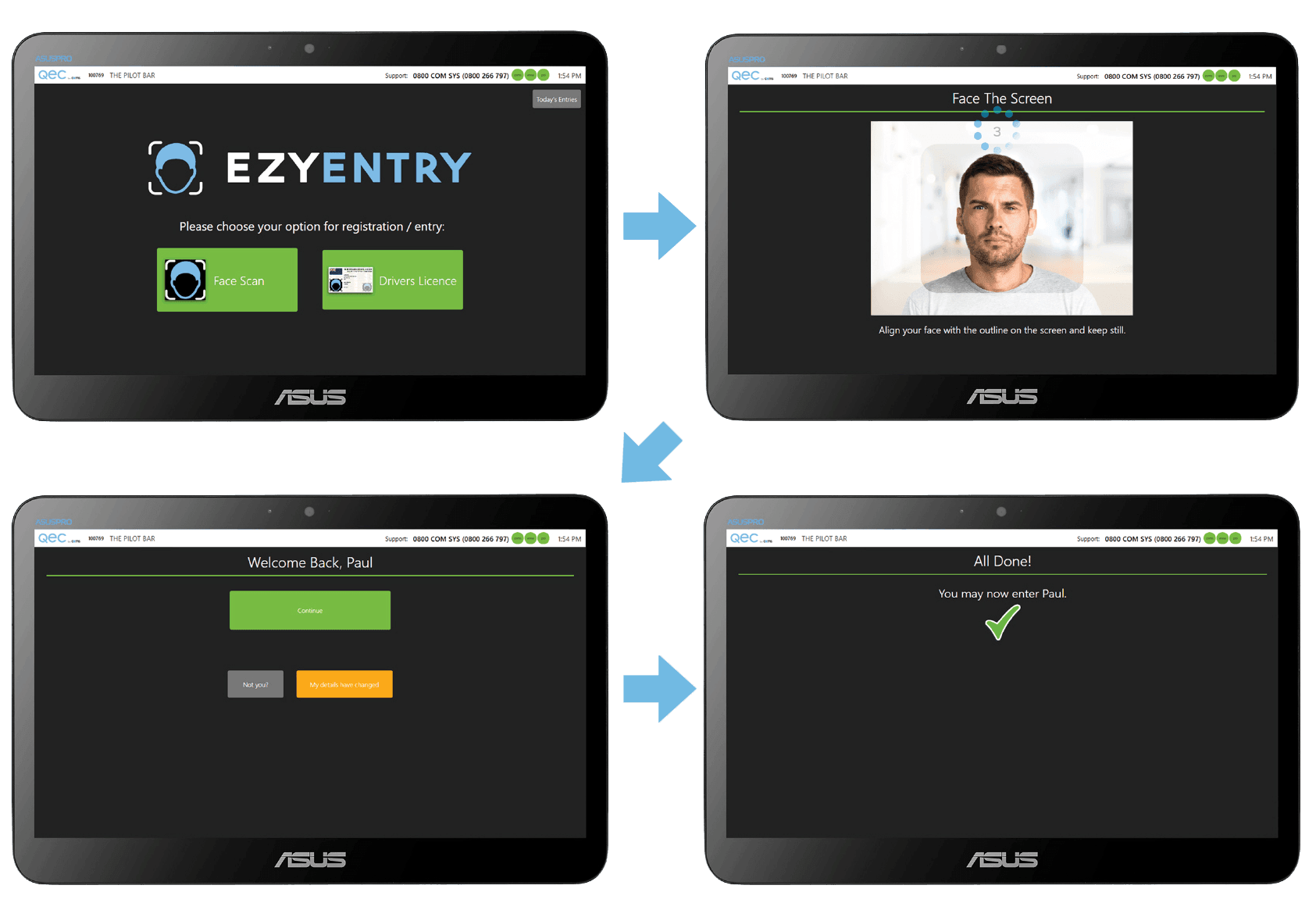 At its core, Ezy Entry offers a self-service electronic register that uses facial recognition software to quickly and accurately identify guests. On their first visit, users simply scan their driver’s licence or have their photo taken on a secure tablet. The system walks them through a simple sign-in process, and from then on, facial recognition takes care of the rest.